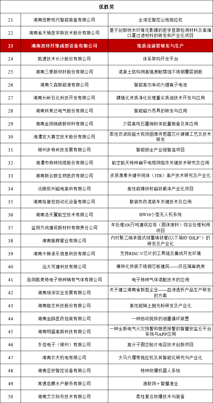 近日,湖南省工信廳公布了2020年“創(chuàng)客中國”湖南省中小微企業(yè)創(chuàng)新創(chuàng)業(yè)大賽決賽獲獎項目,湘潭高新區(qū)企業(yè)湖南雙環(huán)纖維成型設備有限公司的“紙質澆道管研發(fā)與生產”項目榮獲企業(yè)組優(yōu)勝獎。