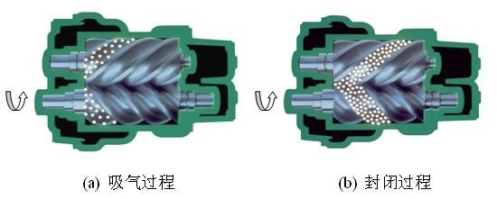 螺桿式空氣壓縮機(jī)的工作原理:電機(jī)驅(qū)動轉(zhuǎn)子,主從轉(zhuǎn)子的齒溝空間在轉(zhuǎn)至進(jìn)氣端壁開口時,其空間大,外界的空氣充滿其中,當(dāng)轉(zhuǎn)子的進(jìn)氣側(cè)端面轉(zhuǎn)離了殼之進(jìn)氣口時,在齒溝間的空氣被封閉在主、從轉(zhuǎn)子與機(jī)殼之間,完成吸氣過程。在吸氣結(jié)束時,主、從轉(zhuǎn)子齒峰與機(jī)殼形成的封閉容積隨著轉(zhuǎn)子角度的變化而減少,并按螺旋狀移動,此為壓縮過程。在輸送過程中,容積不斷減少,氣體不斷被壓縮,壓力提高,溫度升高,同時,因氣壓差而變成霧狀的潤滑油被噴入壓縮腔,從而達(dá)到壓縮、降低溫度密封和潤滑的作用。當(dāng)轉(zhuǎn)子之封閉齒峰旋轉(zhuǎn)到與機(jī)殼排氣口相遇時,被壓縮的空氣開始排放,直到齒峰與齒溝的吻合面移至排氣端面,此時齒溝空間為零,即完成排氣過程。與此同時,主從轉(zhuǎn)子的另一對齒溝已旋轉(zhuǎn)至進(jìn)氣端,形成大空間,開始吸氣過程,由此開始一個新的壓縮循環(huán)。
